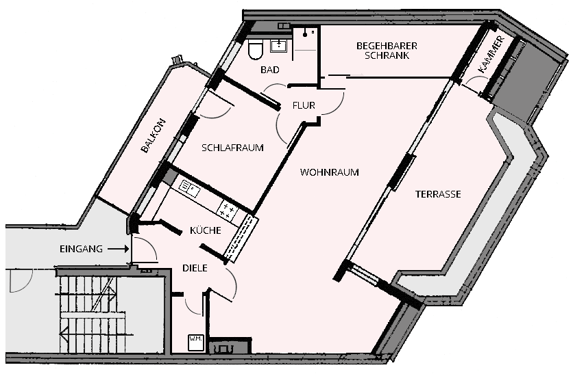 | Aufteilung: | 2 Zimmer, Küche, Diele, Bad, begehbarer Schrank, Terrasse und Balkon |
